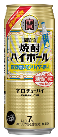 タカラ焼酎ハイボール最強炭酸シリーズ<強烈塩レモンサイダー割り>。超強炭酸の刺激的な飲みごたえと、爽やかな塩レモンサイダー味。糖質ゼロ、プリン体ゼロ、甘味料ゼロ